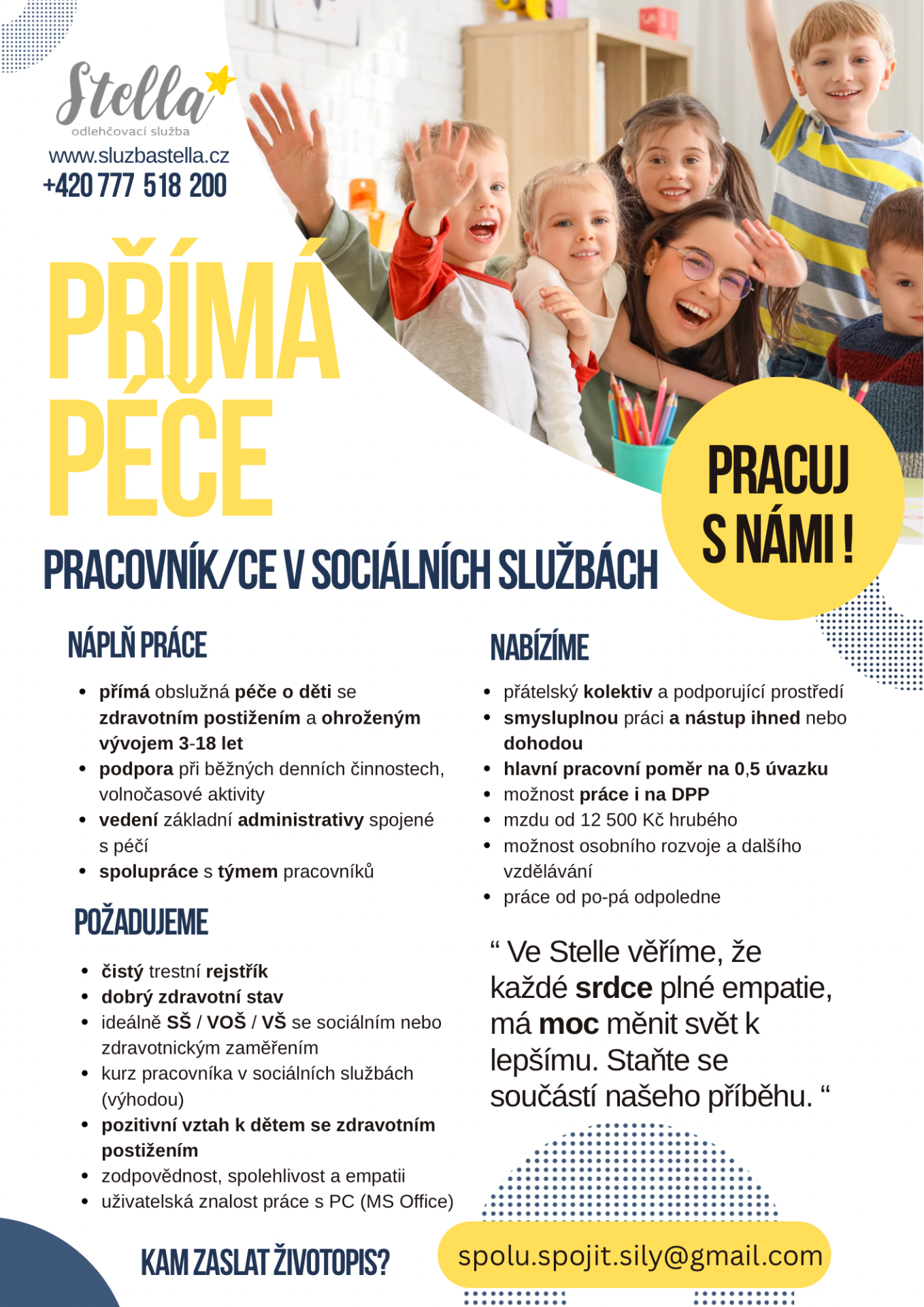 Do odlehčovací služby Stella, hledáme kolegu nebo kolegyni, s otevřeným srdcem, laskavým přístupem a upřímnou chutí pomáhat dětem se zdravotním postižením a ohroženým vývojem ve věku 3-18 let. Pokud máte radost z práce s dětmi a chcete vykonávat činnost, která má skutečný smysl, jste na správném místě. Práce je v přátelském prostředí, s laskavým týmem. Pracovat můžete i v odpoledních hodinách od pondělí do pátku, nabízíme HPP i DPP, vše je na domluvě.